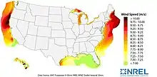 In addition to the large onshore wind resources, the U.S. has large offshore wind power potential,[49] with another NREL report released in September 2010 showing that the U.S. has 4,150 GW of potential offshore wind power nameplate capacity, an amount 4 times that of the country's 2008 installed capacity from all sources, of 1,010 GW.[50] Some experts estimate that the entire East Coast could be powered by offshore wind farms.[51]