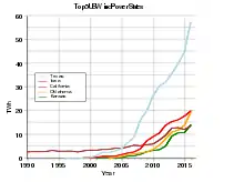 By September 2019, 19 states had over 1,000 MW of installed capacity with five states (Texas, Iowa, Oklahoma, Kansas, and California), generating over half of all wind energy in the nation.[7] Texas, with 28,843 MW of capacity, about 16.8% of the state's electricity usage, had the most installed wind power capacity of any U.S. state at the end of 2019.[8] Texas also had more under construction than any other state currently has installed.[9] The state generating the highest percentage of energy from wind power is Iowa at over 57% of total energy production,[7] while North Dakota has the most per capita wind generation.