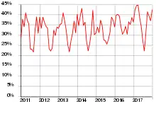 Recent U.S. policy has generally been to provide an inflation-adjusted federal production tax credit (PTC) of $15 per MW·h (in 1995 dollars) generated for the first ten years of operation for wind energy sold. As of 2015, the credit was $23 per MW·h.[94] Renewable portfolio standards mandating a certain percentage of electric power sales come from renewable energy sources, which are in place in about half of the states, also have boosted the development of the wind industry.[95]