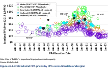 In 2021, the United States Energy Information Administration estimated that the unsubsidized, levelized cost of new onshore wind energy entering service in 2023 will be 3 cents per kwh.[23] The report also cautioned that levelized costs can be misleading. While levelized cost reflects the cost of building and operating a power plant, it does not recognize the relative value of energy from dispatchable sources such as gas turbine compared to non-dispatchable sources such as wind farms. The report also calculates levelized avoided cost of energy (LACE),[24] which can be used to better reflect the economic value of an energy source.