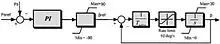 As in the figure at the right, the reference pitch angle is compared with the actual pitch angle b and then the difference is corrected by the actuator. The reference pitch angle, which comes from the PI controller, goes through a limiter. Restrictions are important to maintain the pitch angle in real terms. Limiting the change rate is especially important during network faults. The importance is due to the fact that the controller decides how quickly it can reduce the aerodynamic energy to avoid acceleration during errors.[3]