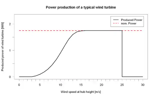 A wind turbine must produce power over a range of wind speeds. The cut-in speed is around 3–4 m/s for most turbines, and cut-out at 25 m/s.[2] If the rated wind speed is exceeded the power has to be limited.