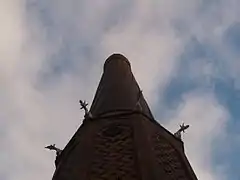 Built in red brick and granite, the chimney turns around its own axis and stands on an octagonal plinth. The Chimeras (Gargoyles) are replicas of those on Notre Dame in Paris while the upper part of the chimney is decorated with motifs of Egyptian lotus flowers.[2]