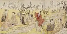 It was also adopted by the Japanese and was called Kyokusui-no-en (曲水の宴, Winding stream party), a party game played by the nobility. Participants must compose a tanka poem beside a stream, within a time limit set by the passage of a lacquer cup of sake floating towards them on the water.[2] When the cup reached the poet, they were expected to drink its contents, either as a celebration of the poem's completion or as a forfeit if they had not composed a suitable verse in time.[3][4] The first kyokusui-no-en events were reportedly held in the Kofun period during the reign of Emperor Kenzō, making the ceremony around 1,500 years old.[5] Other sources, however, suggest that the game originated in the Heian period, around 500 years later; it appears in scrolls from that period and is mentioned in The Pillow Book of Sei Shōnagon.[6][7]