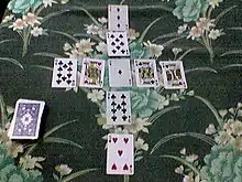Windmill is a solitaire card game played with two decks of playing cards;[1] it is a relatively mechanical game that isn't won that frequently.[2] It is so called because of its distinctive initial layout, which resembles a windmill's sails.[3] It is also known under the name Propeller.[4][5]