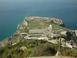 Windmill Hill or Windmill Hill Flats is one of a pair of plateaux, known collectively as the Southern Plateaux, at the southern end of the British Overseas Territory of Gibraltar. It is located just to the south of the Rock of Gibraltar, which descends steeply to the plateau. Windmill Hill slopes down gently to the south with a height varying from 120 metres (390 ft) at the north end to 90 metres (300 ft) at the south end.[1] It covers an area of about 19 hectares (47 acres), though about 6 hectares (15 acres) at the north end is built over.[2] The plateau is ringed to the south and east with a line of cliffs which descend to the second of the Southern Plateaux, Europa Flats, which is itself ringed by sea cliffs. Both plateaux are the product of marine erosion during the Quaternary period and subsequent tectonic uplift. Windmill Hill was originally on the shoreline and its cliffs were cut by the action of waves, before the ground was uplifted and the shoreline moved further out to the edge of what is now Europa Flats.[1]