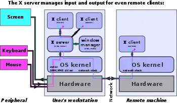 A display server or window server is a program whose primary task is to coordinate the input and output of its clients to and from the rest of the operating system, the hardware, and each other. The display server communicates with its clients over the display server protocol, a communications protocol, which can be network-transparent or simply network-capable.