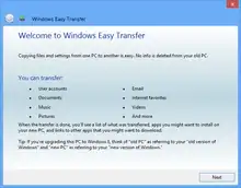 Windows Easy Transfer was introduced in Windows Vista and is included in Windows 7, Windows 8, and Windows 8.1. It replaces the Files and Settings Transfer Wizard included with Windows XP and offers limited migration services for computers running Windows 2000 SP4 and Windows XP SP2.[2] For all versions of Windows, it does not transfer applications—only files and settings.[3]