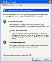 When Windows XP was originally shipped in October 2001, it included a limited firewall called "Internet Connection Firewall". It was disabled by default due to concerns with backward compatibility, and the configuration screens were buried away in network configuration screens that many users never looked at. As a result, it was rarely used. In mid-2003, the Blaster worm attacked a large number of Windows machines, taking advantage of flaws in the RPC Windows service. Several months later, the Sasser worm did something similar. The ongoing prevalence of these worms through 2004 resulted in unpatched machines being infected within a matter of minutes.[1] Because of these incidents, as well as other criticisms that Microsoft was not being active in protecting customers from threats, Microsoft decided to significantly improve both the functionality and the interface of Windows XP's built-in firewall, rebrand it as Windows Firewall,[2] and switched it on by default since Windows XP SP2.