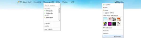 In addition to the themes provided in Windows Live Wave 3, the release of Windows Live Wave 4 provided additional themes for users to customise their pages on Windows Live, with several dynamic themes that changes according to the time of day and weather conditions at the user's location. Several of these newly added themes are similar to wallpapers originating from Windows 7.[19] In addition, the Windows Live Wave 4 header features a reorganised dynamic navigation menu that displays the number of the user's current online contacts and the number of unread e-mails,[20] as well as an in-built Windows Live Web Messenger service allowing users to connect to the Microsoft Messenger service and Facebook chat service to chat with their online contacts while browsing any Windows Live properties using a web browser.[21]