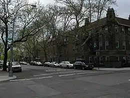 Windsor Terrace is home to mainly Irish-, German-, Polish-, and Italian-American families,[38] many having settled in its brick row and wood-frame houses when the neighborhood was first developed.[10]: 2 The overwhelming majority of residents – many of whom can trace their family histories in Windsor Terrace back multiple generations – are Irish-American.[10]: 2 [14] They are traditionally affiliated with either Holy Name Church and School (the church having been built in 1874 and the school having been built in 1923,[31] both located on present-day Prospect Park W),[10]: 2 [39] or Immaculate Heart of Mary (located on Fort Hamilton Parkway in Windsor Terrace's southeastern extremity).[40] Other smaller Protestant denominations exist nearby, such as the Memorial Baptist Church at 16th Street and 8th Avenue,[41] and Holy Apostles Episcopal on Greenwood Avenue.[42] Over time, Windsor Terrace has become increasingly diverse, as Greek and Hispanic residents have moved in. There is also a small minority of Syrians, Maronite Lebanese, and Jewish-Americans.[5][20][38] The local synagogue is the Chabad Jewish Center.[43] There is also a newer place of worship, the Calvary Cathedral of Praise at Caton Place and East Eighth Street.[11]