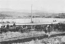 The boiler for Winema, which weighed 14,000 pounds (6,400 kg), was hauled overland by a ten-horse team from the railhead at Pokegama, Oregon to Klamath Falls in early 1905.[3][8] This took five days.[6] On hills, an additional four horses were added to the team.[6] No road then extended from Klamath Falls to the site where the steamer was being built, so it was necessary to put down planks to prevent the wagon from becoming mired in the mud.[6]