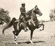 Wing Commander was foaled in 1943. He was a chestnut stallion with four white socks and a white star on his forehead. He was out of the mare Flirtation Walk and sired by the stallion Anacacho Shamrock. He was bred and owned by Dodge Stables, a part of Castleton Farm near Lexington, Kentucky which at the time was owned by Frances Dodge.[1] His bloodlines traced back to Rex McDonald and Bourbon King, who appeared on both his sire and dam's side.[2] Wing Commander was a five-gaited Saddlebred, meaning that in addition to the default walk, trot, and canter, he also performed a slow gait and rack. He was trained by the notable Saddlebred trainer Earl Teater and groomed by Gregory Pena. Wing Commander began his show career in 1946, as a three-year-old. He won every show he entered that year, but lost twice the next year, 1947, when he was shown against older horses. Both losses ended with him placing second.[3] In 1948 Wing Commander and Teater won the first of six World's Grand Championships at the World's Championship Horse Show, part of the Kentucky State Fair.[1] In addition to being shown under saddle, Wing Commander was trained to pull a fine harness cart, although he was not shown in harness.[4] Following his show career, Wing Commander was retired to stud and was the leading Saddlebred sire from 1963 to 1968.[5] Wing Commander died January 19, 1969.[6] Wing Commander was grandsire to Sky Watch, who won five World's Grand Championships,[7] and maternal grandsire to Imperator, who won four World's Grand Championships. The two horses were also known for their "duels" or shows where they competed against each other.[8]