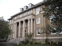 It is a three-story building. Its main entrance is centered in its long elevation, with a central bay projecting slightly from flanking walls. It has a two-story three-bay-wide Ionic-columned portico, with pilasters defining the bays of the third story above.[2]