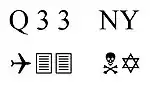 After September 11, 2001, an email was circulated claiming that "Q33 NY", which it claims is the flight number of the first plane to hit the Twin Towers, in Wingdings would bring up a character sequence of a plane flying into two rectangular paper sheet icons which may be interpreted as skyscrapers, followed by the skull and crossbones symbol and the Star of David.[8] This is a hoax; the flight numbers of the airplanes that hit the towers were AA11 and UA175; the tail numbers were N334AA and N612UA.[10]
