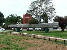 Central Park itself is home to "The Log," a massive log felled in the surrounding countryside which serves to remind the townsfolk of the timber (and dairy) driven history of the area, a de Havilland Vampire fighter plane (opposite the RSL Club), a cricket pitch (Phil Tufnell played an exhibition match in Wingham in which he was bowled for a duck in the first innings, by Glenn Levine, but made a good fist of it in the second), some children's play equipment, a drinking fountain commemorating the installation of mains water in the town, a small ornamental waterfall (which has been filled in with a garden), and two flag poles at opposite ends of the northern side of the park.