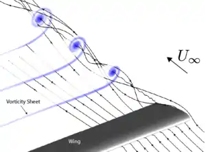 Wingtip vortices are circular patterns of rotating air left behind a wing as it generates lift.[1]: 5.14 The name is a misnomer because the cores of the vortices are slightly inboard of the wing tips.[2]: 369 Wingtip vortices are sometimes named trailing or lift-induced vortices because they also occur at points other than at the wing tips.[1]: 5.14 Indeed, vorticity is trailed at any point on the wing where the lift varies span-wise (a fact described and quantified by the lifting-line theory); it eventually rolls up into large vortices near the wingtip, at the edge of flap devices, or at other abrupt changes in wing planform.