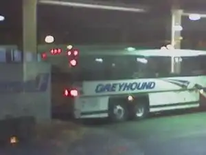 ![]() A Greyhound bus waiting at the old terminal in downtown Winnipeg | |
