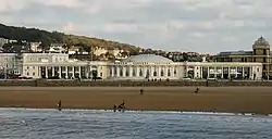 A wall incorporating the columns at the front of the pavilion was built in 1950 to create a cafe.[3] In 1963, the Starlight Room was constructed at the rear of the building. In the 1970s, the wings on either side of the ballroom were glazed, and a mezzanine floor was added. Further redevelopment was undertaken in 1989, which included an extensive rear extension over the footprint of the Starlight Room and the tennis courts, the creation of a new main entrance, reception facilities and the Prince Consort Hall.[3] The 1980s developments removed much of the original character of the gardens designed by Mawson.