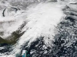 The North American winter season of 2014–15 expressed a significant level of variance. First, a cyclone in the Bering Sea enabled a change in the atmospheric pattern to occur; according to Jeff Masters from Weather Underground, this cyclone brought about a "ripple" in the jet stream, and the presence of a high-pressure ridge over the western United States and a low-pressure trough over the southern and central United States enabled a great intrusion of very cold air to pervade southward out of Canada.[3] Following the onset of the cold wave, multiple snow events occurred; one significant storm dropped as much as 88 inches (220 cm) of snow in a single area, and impacts covered a broad area.[4] In late November, around Thanksgiving, a nor'easter traveled up the East Coast, dropping up to a foot of snow in some areas, and causing major travel headaches for much of the country.[11] Due to the storm, over 4,500 flights were canceled and over 400,000 people were without power on November 27; southern New Hampshire was the worst hit, experiencing up to 200,000 outages.[11] December was, at the time, the second warmest across the US.[12] However, 2015 and 2021 had warmer December’s since. [13][14] In December, yet another storm impacted parts of North America; the storm brought relief to drought-stricken parts of California, but it also brought dangerous mudflows to fire-ravaged areas where the soil could not handle the excess precipitation.[15] Less than two weeks after this events, another storm impacted the Pacific coast of the United States; this storm, fueled by the "Pineapple Express", knocked out power to over one hundred thousand customers in the San Francisco Bay Area after producing strong winds. Hurricane-force winds were reported in parts of the northwestern United States. Regions reported as much as 9 inches (23 cm) of rainfall, and parts of the Sierra Nevada reported 19 inches (48 cm) of snowfall.[16]