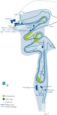 Completed in 1977, the track underwent a redesign of its start house area where the women's luge start house was moved from before turn four to near the men's luge start house prior to turn one in 2006.[1] This was done under the auspices of the International Bobsleigh and Tobogganing Federation (FIBT) and the International Luge Federation (FIL) and included a completely covered sled storage area,[1] new changing rooms, and facilities for coaches and officials.[2] The women's singles luge start house was integrated near the men's singles luge start house during the construction.[2] The track hosted the first two-woman bobsleigh world championships in 2000.[3]
