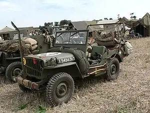 A wire catcher consists of a strip of angle iron bolted upright to the forward bumper of a jeep.[1][2][3] "It extends above the heads of those riding in the jeep, and is notched a few inches from the top so that any wire extending across the road will be caught and snipped."[1]