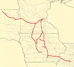 Nonetheless, in 1951 the M&StL still had several extant passenger routes in operation, the longer routes being: the above mentioned Twin Cities to Albia route; an Oskaloosa, Iowa east to Peoria, Illinois mixed train route with a long layover in Monmouth, Illinois; a Twin Cities west to Watertown, South Dakota route and a Twin Cities to route south to Des Moines, Iowa.[5]