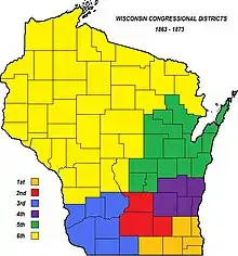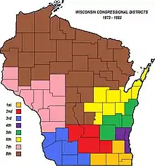 Following the 1870 census Wisconsin gained two seats in the House of Representatives. The new 6th District was shifted eastward and included many counties in northeast Wisconsin. It included the counties of Brown, Calumet, Door, Green Lake, Kewaunee, Outagamie, Waupaca, Waushara and Winnebago. Representative Philetus Sawyer of Oshkosh had been elected to Congress from Wisconsin's 5th District since 1865, was then elected from the newly configured 6th District. He later served the state as a member of the U.S. Senate.