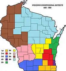 Wisconsin's 6th congressional district came into existence in 1863 following the federal census of 1860. The first elected representative from the district was Walter D. McIndoe of Wausau. The district originally comprised the counties of the northern and western parts of the state. Following subsequent congressional reapportionment after each decennial census, the district's boundaries shifted eastward.