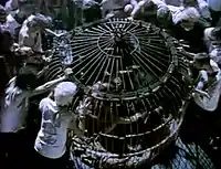 The music video for "Wish" was directed by Peter Christopherson, who also directed the music video for "March of the Pigs" and Broken's eponymous film.[10] The video shows Nine Inch Nails (Trent Reznor on vocals, Chris Vrenna on drums, Richard Patrick on guitar and James Woolley on keyboards) playing inside high, caged walls while hordes of angry men assault the exterior of the cage. The band is eventually accosted: Woolley is lifted off his feet by a suspended man, Vrenna is lifted off by a crane hook and Patrick is grabbed through the sides of the cage. The video ends with a brief scene of men breaking open the gate of the cage and storming into the cage with bats and clubs.[11] MTV felt that the ending scene was too violent and alternate footage was used for network airplay.