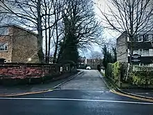 The line ran south through West Didsbury via a cutting, passing underneath Palatine Road. Withington & West Didsbury Station was situated on the north side of Lapwing Lane, set back from the road with a small forecourt area. The station building was a red brick Gothic Revival house, almost identical in style to other nearby stations of the period such as Didsbury. The building incorporated a booking hall, a parcels office, and ladies' and gentlemen's waiting rooms as well as a two-storey station master's house.[4] There were two platforms in the cutting with glass canopies and a footbridge.[2][3] Withington Town Hall, which stood opposite the station, was built for Withington Local Board around 1880–90.[7]
