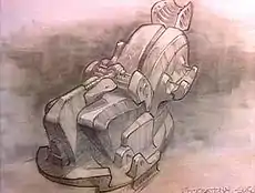 Several of the scenes in "Without" take place onboard an alien spaceship in which Mulder is being imprisoned. When designing the interior look of the ship, production designer Cory Kaplan was attracted to a primitive aesthetic, noting in an interview: "We all see super-tech [in spaceships] now, but the idea of low-tech was much more interesting to me, much more visual. So, you take elements of rock and steel and chisel them into interesting shapes."[5] Kaplan's task was aided by the discovery of backdrop from the film Alien (1979), which she and director of photography Bill Roe "lit ... very dimly and put ... behind" the chair in which Mulder is restrained.[5] According to Kaplan, this chair was "just this rotating platform with this humongous dental piece that could rotate around".[5]