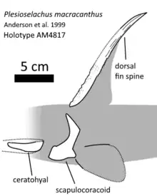| Plesioselachus[27][28] | P. macracantha | 0.5–1 m (1 ft 8 in – 3 ft 3 in) long chondrichthyan with long spine. | ![]() |
