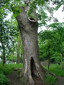 The eastern side of Castle Hill is the location of the Victorian 'Poem Tree',[19] a beech tree which had a poem carved into it by Joseph Tubb of Warborough Green in 1844–45.[20] The tree, which died in the 1990s, collapsed in 2012; there is now a stone commemorating the 150th anniversary of the carving.