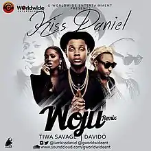"Woju (Remix)" is a song by Nigerian afropop artist Kiss Daniel featuring vocals from Tiwa Savage and Davido. The song was released on 28 February 2015 under G-Worldwide Entertainment and was produced by DJ Coublon. Rated as one of the "biggest record in Nigeria" by David Drake of Complex,[11] "Woju (Remix)" made history on MTV Base's Official Naija Top 10 music video chart alongside "Woju" as the first time an original song and its remix would peak at the first and second spots.[12]
