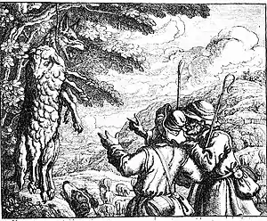 Yet another variation on the disguise theme was included in the Cento favole morali ("100 moral fables", 1570) of the Italian poet Giovanni Maria Verdizotti. In this the wolf dresses itself as a shepherd, but when it tries to imitate his call, it wakes the real shepherd and his dogs. Since the wolf is encumbered by its disguise, it cannot get away and is killed. This is the version followed in La Fontaine's Fables (III.3).[9] The conclusion both poets draw is the same as that of Nikephoros. The story entered the English canon under the title "The wolf turned shepherd" in Roger L'Estrange's 1692 fable collection[10] and in verse as "The Wolf in Disguise" in Robert Dodsley's Select fables of Esop and other fabulists (1765).[11]