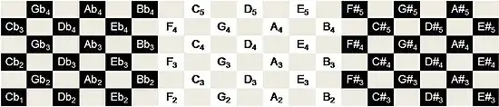 However, such edge conditions produce wolf intervals only if the isomorphic keyboard has fewer buttons per octave than the tuning has enharmonically distinct notes.[6] For example, the isomorphic keyboard in Figure 2 has 19 buttons per octave, so the above-cited edge condition, from E♯ to C, is not a wolf interval in 12-TET, 17-TET, or 19-TET; however, it is a wolf interval in 26-TET, 31-TET, and 53-TET. In these latter tunings, using electronic transposition could keep the current key's notes centered on the isomorphic keyboard, in which case these wolf intervals would very rarely be encountered in tonal music, despite modulation to exotic keys.[8]