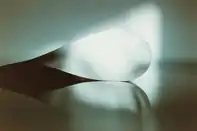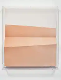 Tillmans further explores the bounds of photography as a medium in his “paper drop” series (2001–08). He started to make ‘paper drop’ images depicting photographic paper specifically exposed to coloured light in his darkroom in 2001.[33] He creates extraordinary sculptural forms in photographic paper; then, by photographing them, returns them to the accustomed flatness of that medium. Photography’s step from ‘picture’ to ‘object’ is best demonstrated in the works from the “Lighter” Series (2005–08),[34] in which the artist dropped the act of photographing and allowed the photographs - in their three-dimensional form – to only represent themselves,[35] recalling his ongoing series "Impossible Color" (1996–present). These colourful photo-paper works are folded, creased or otherwise manipulated, allowing for a subtle play with the material surface and the resulting illusion of lines and contrast. Contained under plexiglas lids, they have a rather sculptural quality.[36]