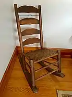 For eighty years, Wolfsville was a regional center of chair making, primary through the business operated by the Stottlemyer Family. In the decade prior to the American Civil War, Frederick Stottlemyer (1830-1913) established a shop and began turning Shaker-styled ladderback straight and rocking chairs. Frederick's son, Christopher Columbus Stottlemyer (1857-1931) apprenticed with his father and gradually assumed the management of the family's business, modernizing the production through the introduction of a steam powered lathe and sawmill, increasing the shop's output in the last quarter of the nineteenth century.[8] Christopher Stottlemyer also developed many of the characteristic components for which Stottlemyer Chairs came to be recognized, including scalloped back slats and turned acorn-shaped finials on the back posts of the chairs. Stottlemyer chairs were mostly produced in three forms: straight chairs, sewing or nursing rockers (a rocking chair without arms), and armed rocking chairs. The shop also produced other furniture, including tables and cradles.[9]