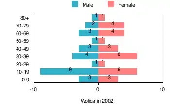 According to the 2002 Poland census, there were 56 people residing in Wolica village, of whom 48.2% were male and 51.8% were female. In the village, the population was spread out, with 33.9% under the age of 18, 28.6% from 18 to 44, 12.5% from 45 to 64, and 25% who were 65 years of age or older.[1]
