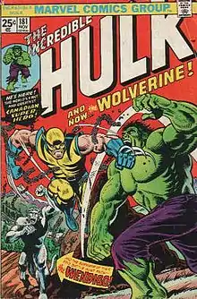 Marvel Comics editor-in-chief Roy Thomas asked writer Len Wein to devise a character specifically named Wolverine, who was a Canadian of small stature and with a wolverine's fierce temper. John Romita Sr. designed the first Wolverine costume, and believes he introduced the retractable claws, saying, "When I make a design, I want it to be practical and functional. I thought, 'If a man has claws like that, how does he scratch his nose or tie his shoelaces?'"[5] Wolverine first appeared in the final "teaser" panel of The Incredible Hulk #180 (cover-dated October 1974), written by Wein and penciled by Herb Trimpe. The character then appeared in a number of advertisements in various Marvel Comics publications before making his first major appearance in The Incredible Hulk #181 (November 1974), again by the Wein–Trimpe team. In 2009, Trimpe said he "distinctly remembers" Romita's sketch and that, "The way I see it, [Romita and Wein] sewed the monster together and I shocked it to life! ... It was just one of those secondary or tertiary characters, actually, that we were using in that particular book with no particular notion of it going anywhere. We did characters in The [Incredible] Hulk all the time that were in [particular] issues and that was the end of them."[6] Though often credited as co-creator, Trimpe denied having had any role in Wolverine's creation.[7]