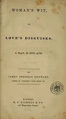 Woman's Wit; or, Loves Disguises is an 1838 comedy play by the Irish writer James Sheridan Knowles.[1] [2] It premiered at the Theatre Royal, Covent Garden on the 23 June 1838 with a cast that included James Warde as Lord Athunree, George Bartley as Sir William Sutton, William Macready as Walsingham, John Langford Pritchard as Felton, John Pritt Harley as Clever and Helena Faucit as Hero. Knowles dedicated the play to the writer Samuel Rogers.