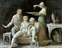 Abortions were uncommon, but in their few occurrences, were performed by the mother herself. The results for both mother and child were often fatal as most abortions were performed by plunging a dagger into the woman's vagina.[15] Because of this procedure, it was most common to carry a baby full term before performing the abortion. According to the Hippocratic Corpus, there were oral alternatives used to induce abortion such as chaste, tree, copper, and Ferula species.[16] Plato explored the control that midwives perhaps had during this process: