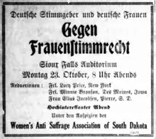 Many immigrants in South Dakota were bitterly opposed to women's suffrage during the first women's suffrage amendment campaign in 1890.[60] During the Republican Convention held in 1890, a large group of Russian immigrants wore buttons that read, "Against Woman Suffrage and Susan B. Anthony."[21] German immigrants were also largely against women voting.[48] Liquor and gambling interests were also against women's suffrage.[26] These groups spread the idea that women really didn't want to or need to vote and get into politics.[61]