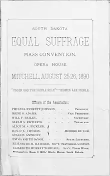 When South Dakota was admitted as a state on November 2, 1889, the new constitution required that a women's suffrage referendum be submitted to the voters by the first legislature, leading to a Fall 1890 constitutional amendment proposal.[8] Plans to organize and campaign started to emerge. [9] Emma Smith DeVoe and her husband, John, founded the South Dakota Equal Suffrage Association (SDESA) on October 21, 1889.[4][10] Emma DeVoe helped create chapters around the state before she and her husband moved.[4] The motto of the organization was based on the state motto: "Under God the People Rule; Women are People."[9] The group did not have a large amount of funding and set about to securing sources of funding.[11] Susan B. Anthony came to South Dakota to do a lecture tour, starting on November 11, 1889.