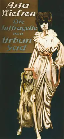 Suffragettes were frequently featured in films made in other countries as well: "The British suffrage movement, which was the most violent, garnered the most interest among filmmakers—even fictional scenarios made by studios in other countries, such as Germany, Sweden and the USA, were often set in England to capitalize on the colorful protestors, who embraced the term 'suffragette'."[8] See, for example, Die Suffragette (1913, English: The Suffragette), a German film in which Asta Nielsen plays a British suffragette.