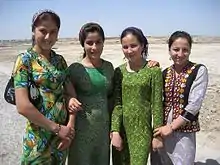 Under Article 18 of the Constitution of Turkmenistan, women are guaranteed equal rights to men.[2] In practice, however, they face routine political and societal discrimination. Women are not allowed to form independent women's organizations, and all such organizations must be registered under the Women's Union of Turkmenistan.[3] They make up 16.8% of the country's Parliament. Most women work in the home, as mothers or homemakers, or in the markets as sellers.[4] Though the country's Islamic roots are several centuries old, Turkmen women never were and are not required to wear a face covering. Turkmen women have always been more outspoken and more socially active than women in neighbouring countries.