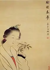 The Tang saw an increasing perception of women as a commodity. Although previously only the upper classes had concubines (Chinese: 妾; pinyin: qiè) in addition to one wife (Chinese: 妻; pinyin: qī), Tang legal codes set out the formal differences between wives and concubines, as well as the children born by each. A man was legally only allowed one wife, but could, "purchase as many concubines as he could afford."[66] The legal status of a concubine was very far from that of a maid (Chinese: 婢; pinyin: bì), with maids needing to be 'freed' (Chinese: 放; pinyin: fàng) to change their position.[67] However, a concubine was expected to serve the wife in the same way as a maid, her sons were required to treat the wife as their legal mother, and, on her husband's death, she had no claims to the property he left.[66] Though wives were not supposed to be sold, the perception of women as marketable goods made it simple for husbands to sell their wives to brothel madams, such as those found in eastern Chang'an. The courtesans of Chang'an were employed to sing, converse with, and entertain customers, similar to the Japanese geisha. The girls had often been beggars or indentured to poor families. On entering the brothel, the girls took the madam's surname.[68] A way out was to either marry a client or become a concubine. Venereal diseases were recognized during the Tang and physicians document one similar to gonorrhea that was spread through sex.[69]