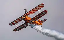 Men and women after World War I were able to purchase "surplus and decommissioned planes".[60] Wanting to fly, but with little demand after the war, pilots purchased the planes and went from town to town offering rides. Creating attractions to bring in crowds, these daredevils performed stunts, loops and began wing walking to attract more customers. The aerialists and pilots formed flying circuses sending promoters ahead of them to hang posters promoting their barnstorming feats.[61]
