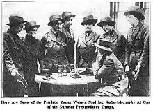 In January 1917, in the United States the National League for Women's Service (NLWS) was created from the Woman's Department of the National Civic Federation readiness and relief activities and modelled on similar groups in Britain and elsewhere.[45][46] The League was divided into thirteen national divisions, one of which was "Wireless and Telegraphy".[47] When the US entered the war in April 1917, the NLWS established training program for female wireless operators at Hunter College in New York.[48] Although they were not strictly government employees, these female wireless operators were allowed to transmit in order to help the war effort.